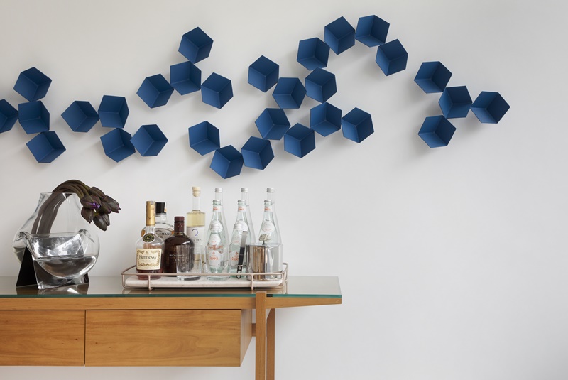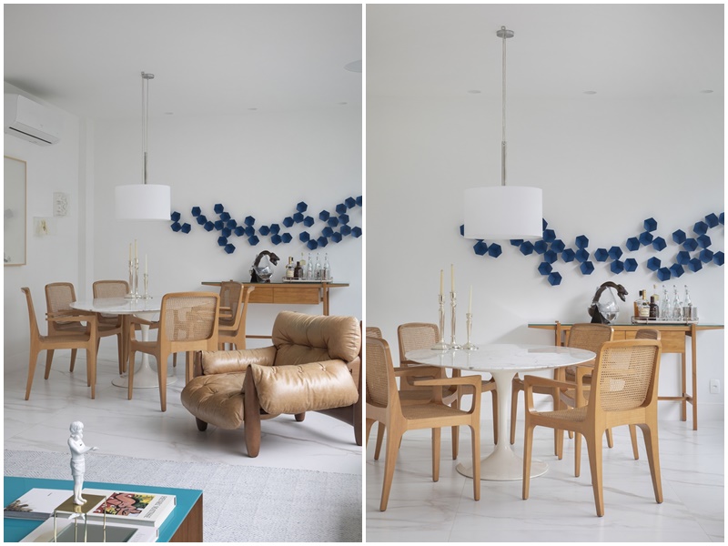 - Escultura de parede azul acima do aparador da sala de jantar: artista Cássio Lázaro