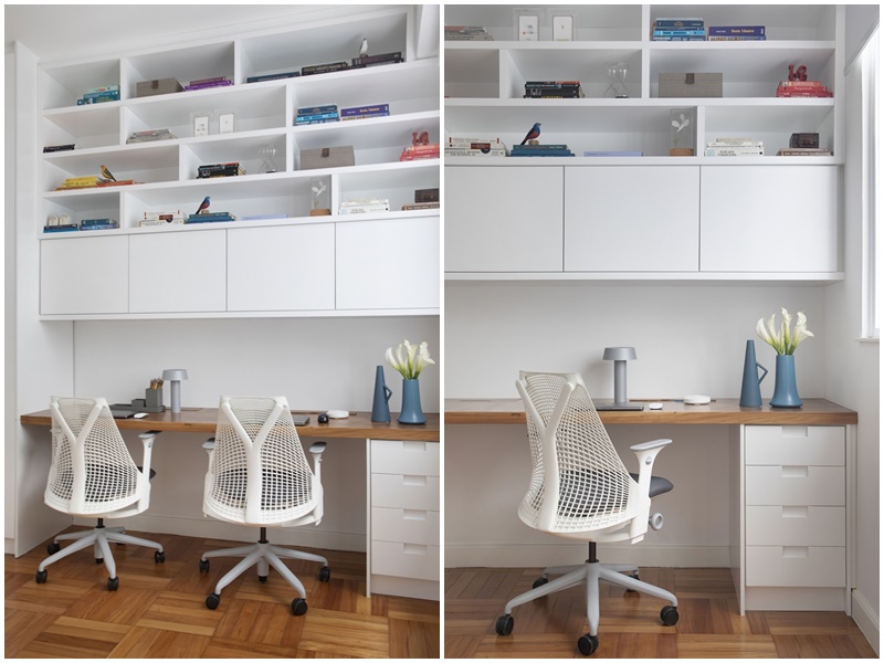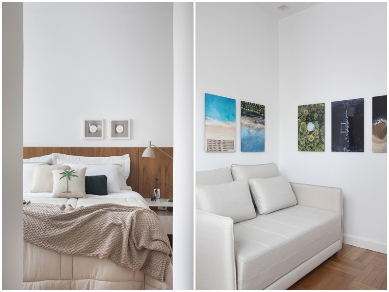 No entanto, no decorrer da obra, o casal se encantou não só com as alterações feitas na planta do imóvel como também pela localização do apartamento, que fica em uma rua tranquila e totalmente residencial, com vista para a copa das árvores. Decidiram, então, que se mudariam do apartamento no Leblon, onde moravam, para o novo endereço, em Ipanema, e pediram ao arquiteto para incluir no projeto a parte da decoração. “No geral, apostamos em uma arquitetura limpa e atemporal, sem excessos, e adotamos uma paleta de cores em tons neutros para destacar a marcenaria, que é mais elaborada, e os inúmeros móveis de design assinado e as obras de arte que já faziam parte do acervo dos clientes e foram aproveitados, já que eles têm extremo bom gosto”, explica ele.