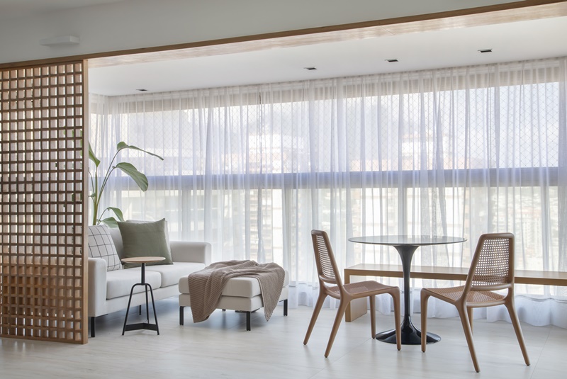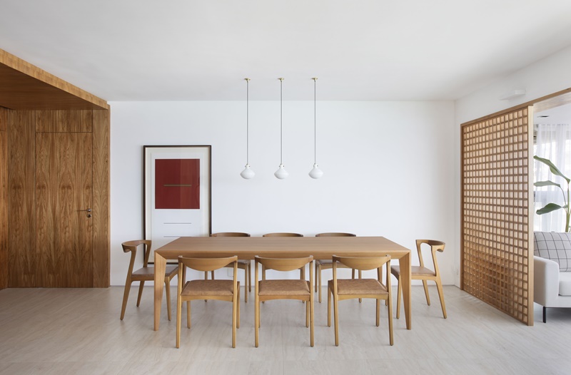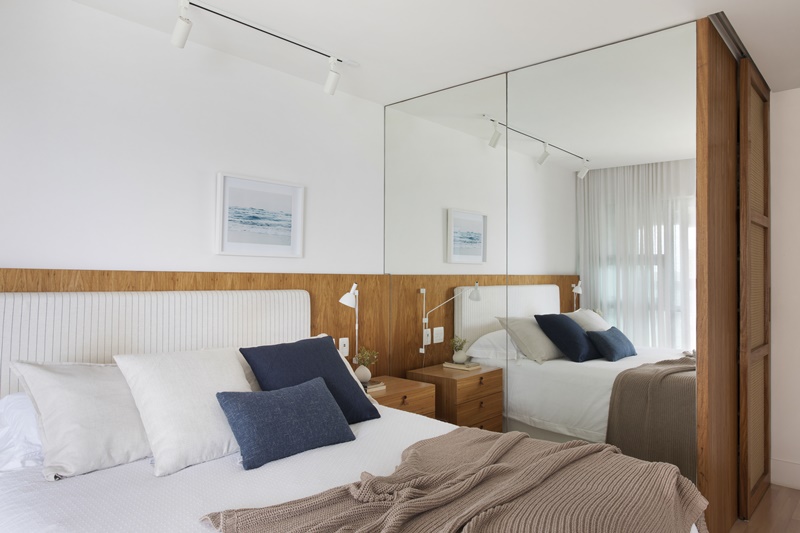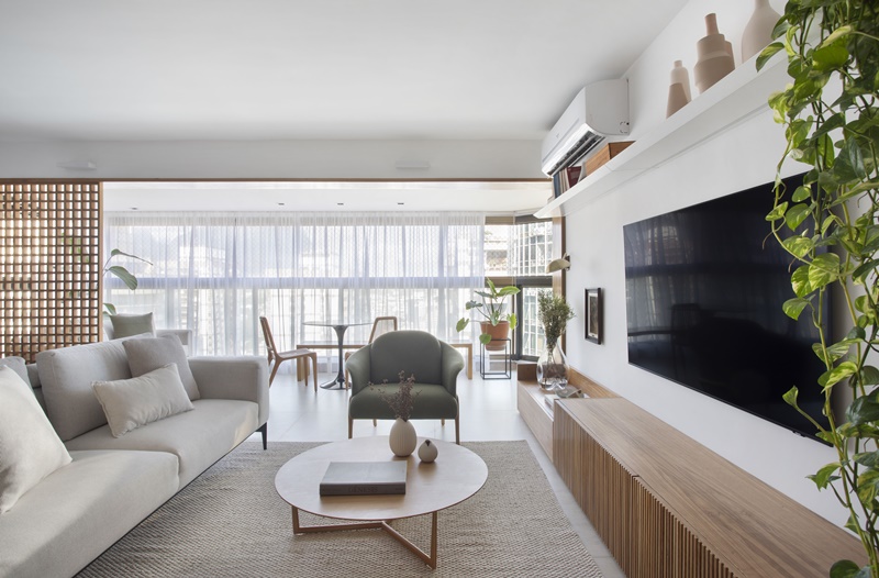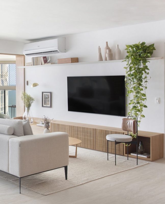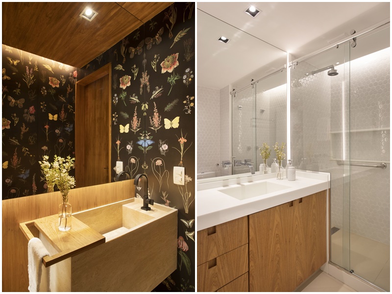 Além de integrar a sala e a varanda, a reforma transformou o banheiro social em lavabo, já que o apartamento já possuía suíte de hóspedes e suíte do casal. “Parte desse antigo banheiro social e parte da circulação íntima foram incorporados à sala, aumentando o espaço do ambiente de estar com tv. Na suíte do casal, deslocamos a porta de acesso ao banheiro para viabilizar a execução do closet logo ao lado”, acrescenta ela.