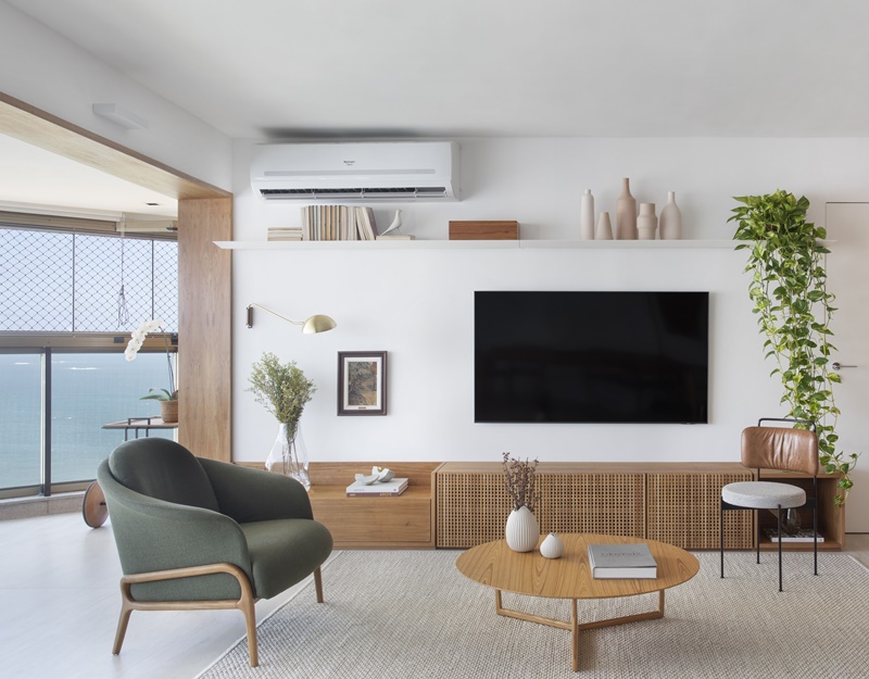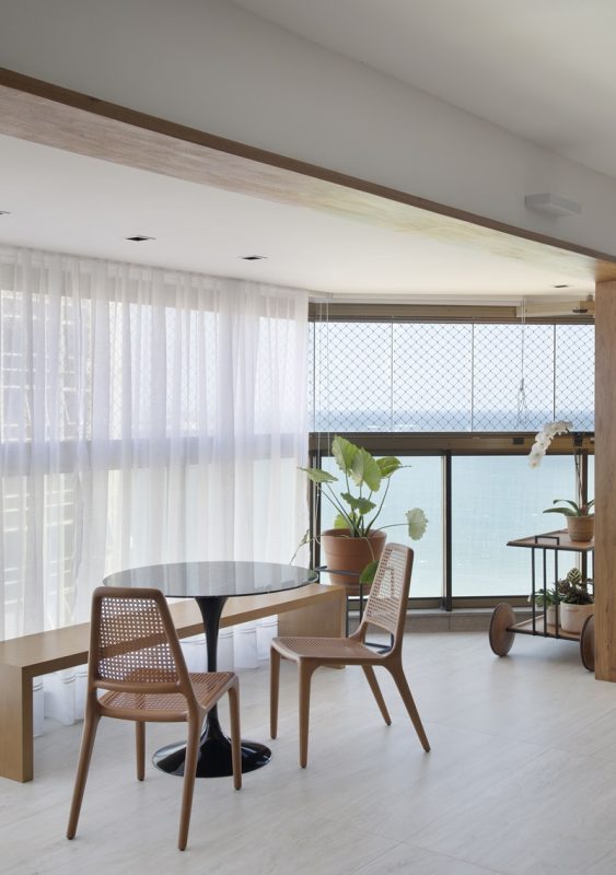 Os moradores deste apartamento de 150m2, localizado na praia da Barra da Tijuca (zona oeste do Rio de Janeiro), são um casal de aposentados, ambos com 70 anos, pais da arquiteta que assinou o projeto (Ana Luisa Cairo), junto com marido Gustavo Prado. Eles são sócios no escritório carioca A+G Arquitetura (@ag_arq).