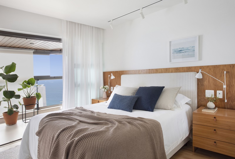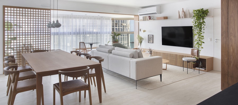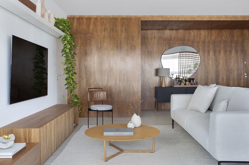 Tanto na sala quanto na suíte do casal os arquitetos apostaram em ambientes leves, que valorizam a luz natural do apartamento, e utilizaram materiais naturais na composição dos espaços. Na sala, por exemplo, eles mesclaram o freijó da marcenaria com a madeira natural do mobiliário e acrescentaram o couro e as tramas naturais em tecidos e tapete. Para imprimir um ar mais elegante no resultado final, eles também inseriram alguns elementos em preto e dourado. “O tom mais escuro do freijó contrasta com o piso claro e com as paredes brancas, que dão amplitude para a sala”, explica Ana Luisa. “Nosso maior desafio neste projeto foi executar o projeto da suíte do casal e da área social em momentos diferentes. Por causa da pandemia, depois que a suíte do casal ficou pronta, tivemos que suspender a obra da área social para retomar depois”, finaliza ela.