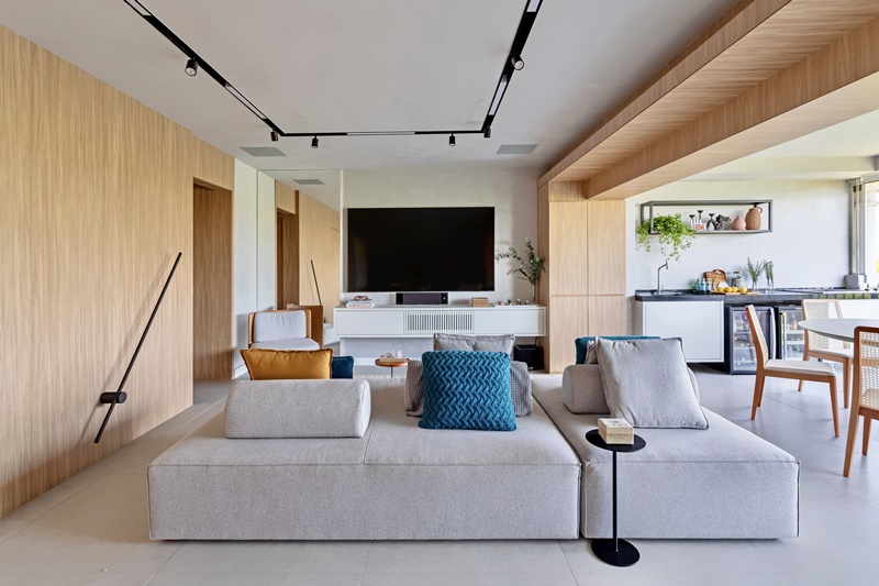 Como os ambientes da área social são integrados, Camila Fleck optou por sofá modulado disposto em ilha, com assentos voltados para todos os lados e encosto móvel, criando ali uma atmosfera descontraída de lounge, que ainda atende a diversas funções: ver tv, relaxar, conviver em família, reunir amigos etc. “Além da versatilidade, outra vantagem é que esse tipo de sofá ocupa menos espaço que dois sofás dispostos da forma tradicional e ainda apresenta um visual bem mais leve”, avalia a arquiteta. A arquiteta também destaca o grande portal da sala, executado em marcenaria, com armários nas laterais e uma sanca iluminada no limite da viga, a 2,20m de altura, no lugar da antiga esquadria que delimitava o espaço da varanda. E ainda o painel de madeira que “envelopa” todo hall de entrada, dando a impressão de ser uma grande caixa de madeira, e continua na parede principal da sala, mimetizando a porta de correr que dá acesso à cozinha.