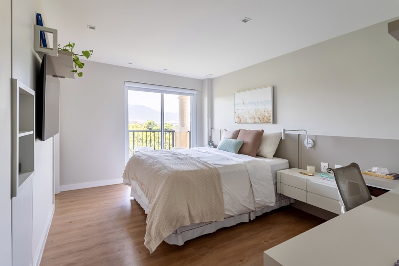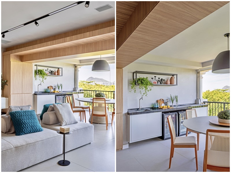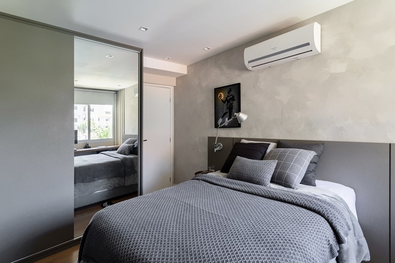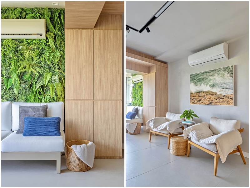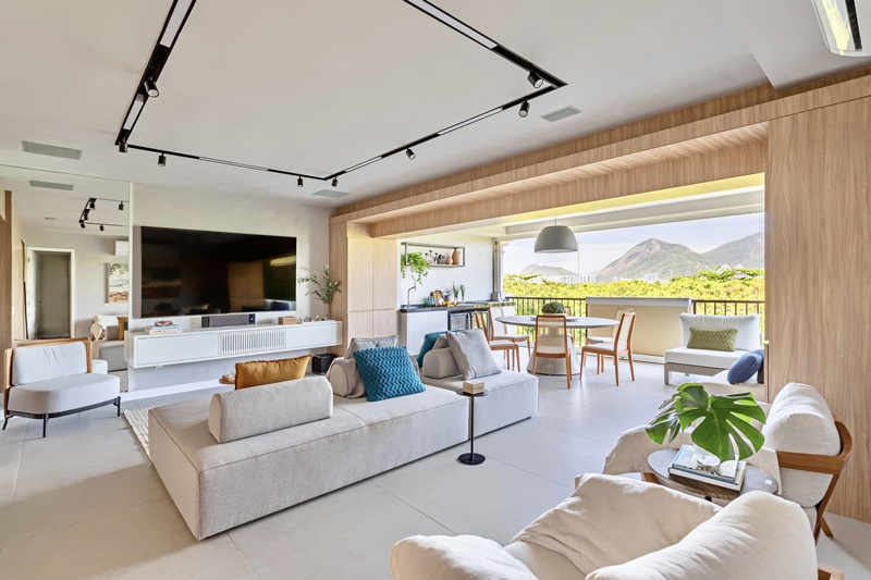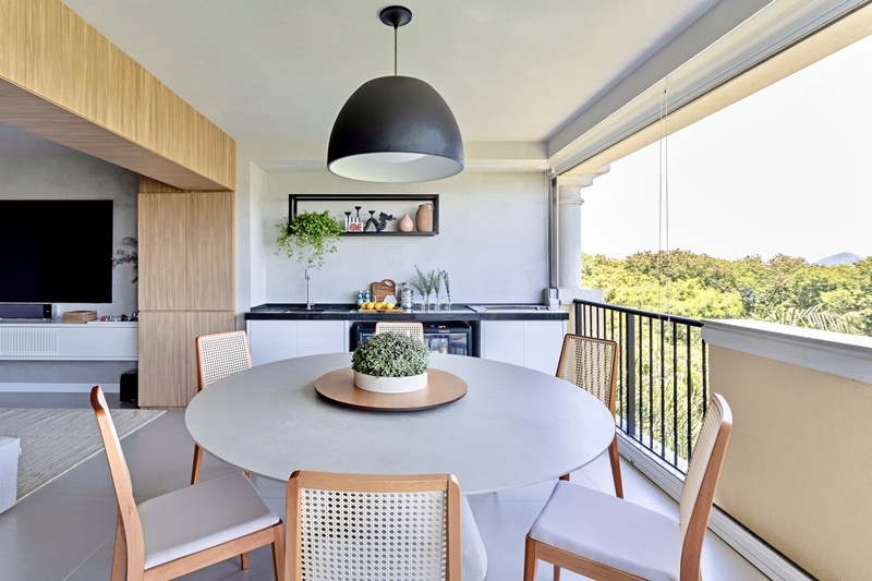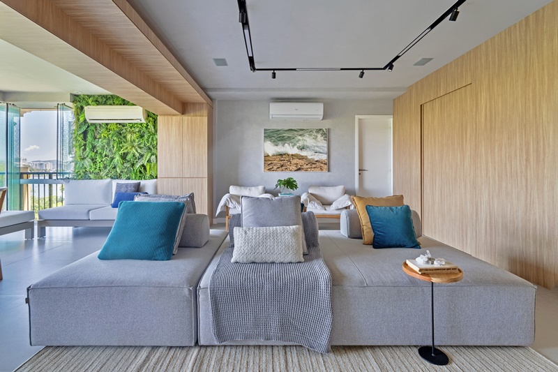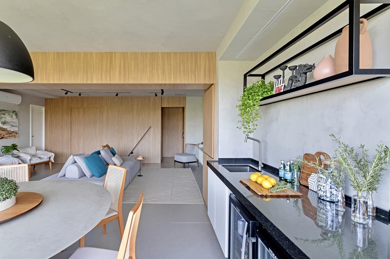 Além de eliminar a esquadria que separava a varanda da sala, a arquiteta também demoliu a churrasqueira da varanda e substituiu o piso existente de toda a área social por porcelanato cinza. Já nos quartos, o porcelanato foi substituído por piso vinílico amadeirado para deixar a área íntima mais acolhedora.