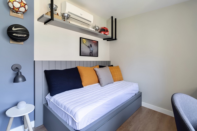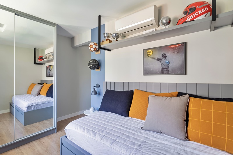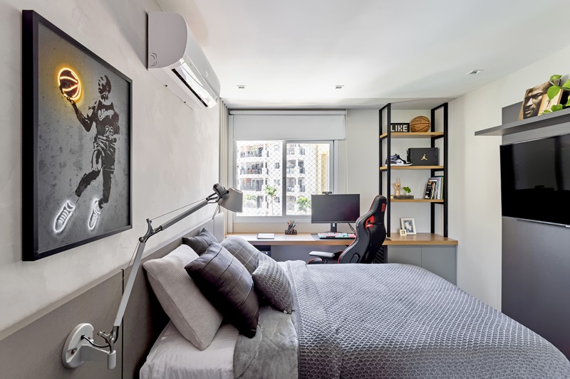 “No quesito decoração, o casal me apresentou referências em tons de cinza e madeira e ambientes bem modernos, com atmosfera minimalista”, conta Camila Fleck. “Já no quarto dos filhos, como eles adoram basquete, tirei partido dos elementos existentes relacionados ao esporte”, acrescenta.