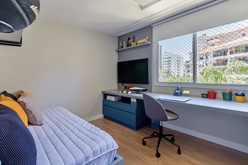 Composta por um casal (ele, comentarista esportivo; ela, dona de casa) com dois filhos (de 8 e 13 anos), a família já morava no imóvel e sentia a necessidade de adaptar os ambientes à atual rotina de cada membro. Eles queriam, por exemplo, eliminar a esquadria da varanda e integrá-la totalmente à sala, junto com a área gourmet, abrindo assim um novo espaço para a sala de jantar (hoje, na antiga varanda). E também pediram à arquiteta para atualizar os quartos dos filhos, que não eram mexidos há muitos anos, não só do ponto de vista estético como também considerando a atual faixa etária de cada um, incluindo bancadas de estudo. Já no quarto do casal, o marido pediu um espaço para ser usado como escritório, com uma bancada bastante espaçosa, uma vez que ele passou a trabalhar em casa no período da pandemia.