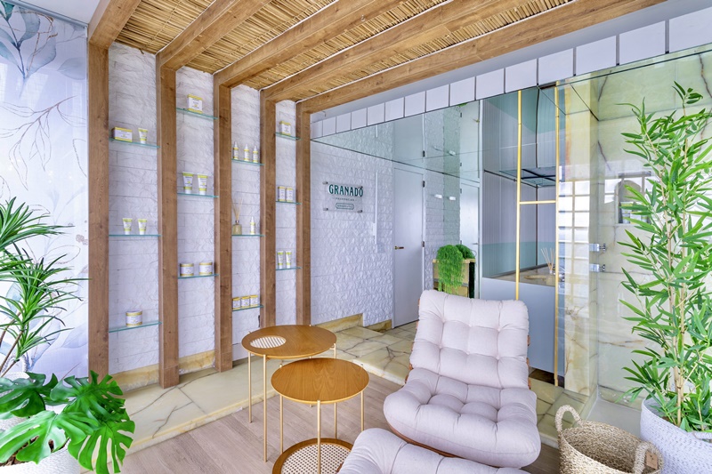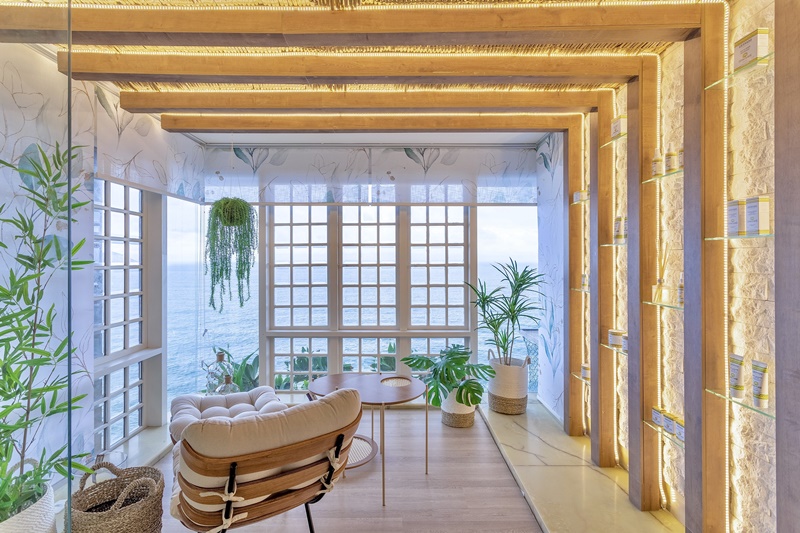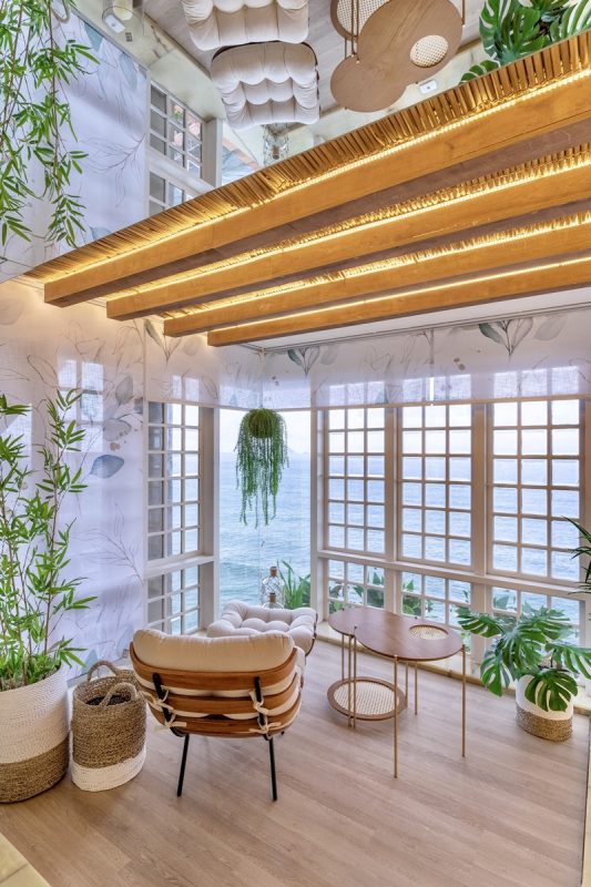 Essa ligação entre o entorno e a “Sala de banho e SPA” é feita por outros elementos além das plantas. “As janelas da sala de banho emolduram o mar de São Conrado, proporcionando aos nossos visitantes um momento de contemplação da paisagem e reconexão com nosso interior. Para trazer esse efeito para dentro do projeto, fizemos uso de materiais naturais, como pedras, madeira e palha, além das cores verde e branco que transmitem paz e leveza”, explica Rosana.