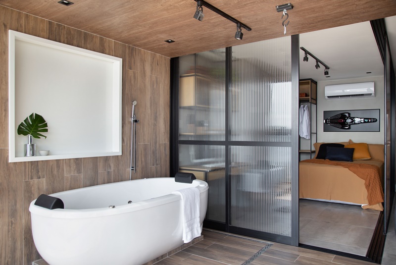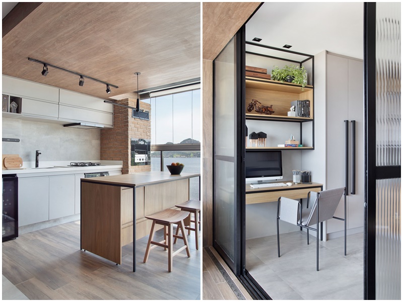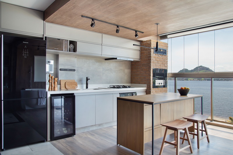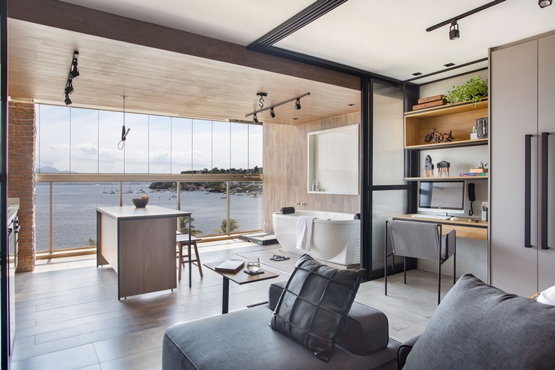 No projeto se destacam ainda a banheira de imersão fora do banheiro, posicionada ao lado da cozinha e de frente para o mar para que o morador possa contemplar a vista da praia enquanto relaxa; e o uso do mesmo porcelanato no padrão madeira no piso, paredes e teto na área próxima à janela, que não só delimita o ambiente da cozinha como também cria uma espécie de moldura da vista do mar. “Nosso maior desafio neste projeto foi, sem dúvida, setorizar os ambientes, mesmo aplicando o conceito de total integração dos espaços”, conclui.
