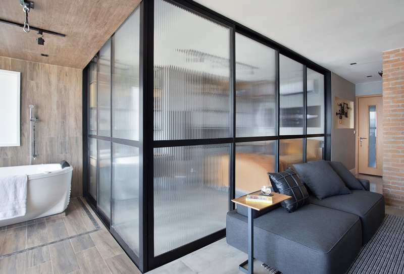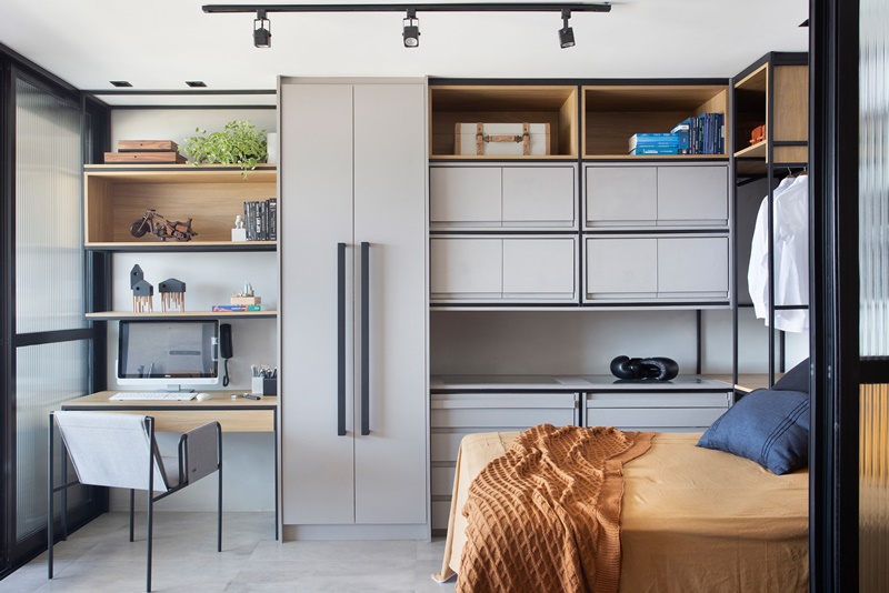 Como o plano era integrar todos os ambientes, algumas paredes de alvenaria tiveram que ser demolidas, deixando, assim, a planta livre para ser setorizada através de esquadrias móveis, em alumínio preto com vidro canelado. Foi este recurso que permitiu delimitar, por exemplo, o quarto de dormir com escritório, que agora pode ser totalmente isolado, quando necessário, sem comprometer a passagem de luz natural, que vem do janelão piso-teto na fachada do prédio.