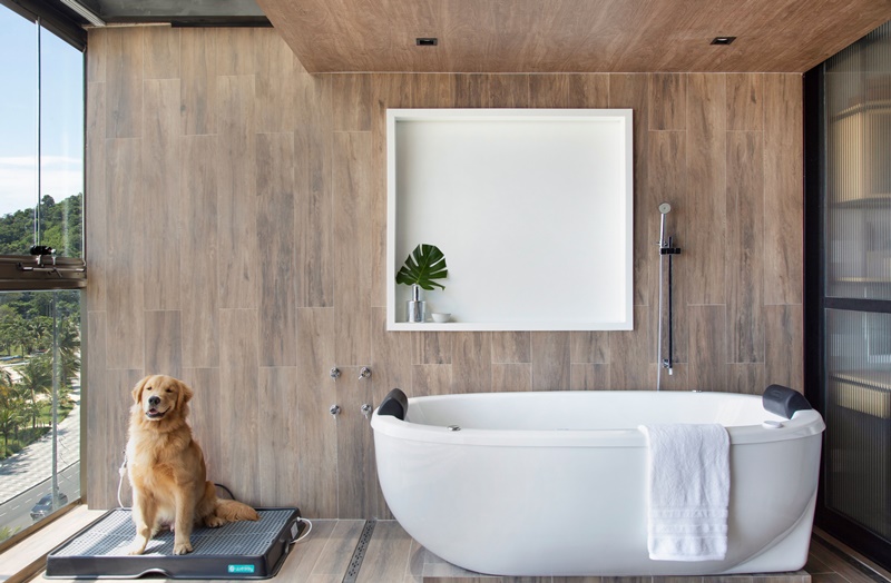 Um dos destaques do projeto é a banheira fora do banheiro, posicionada ao lado da cozinha e de frente para o mar