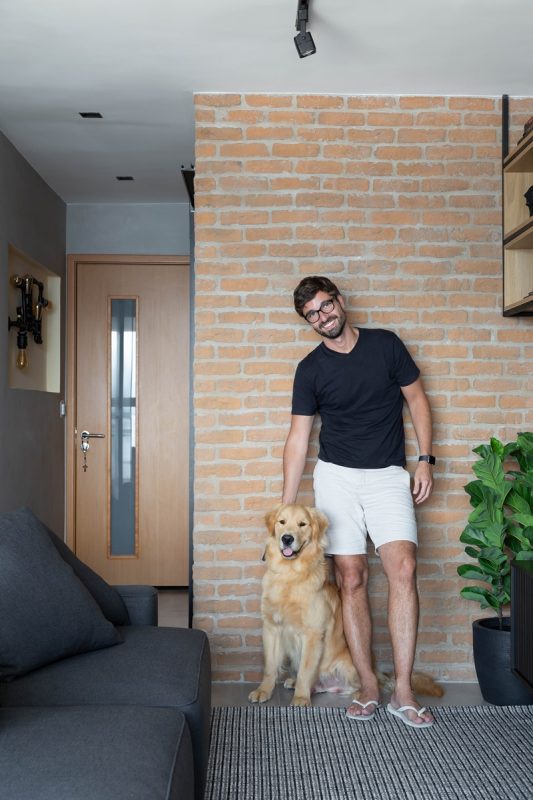 O advogado Alan Gavinho (solteiro, 35 anos) comprou este apartamento com 45m2 no sexto andar de um edifício de frente para a Praia de São Francisco, em Niterói, com a intenção de sair da casa de sua família e levar junto seu pet e fiel escudeiro Alex, da raça golden retriever.