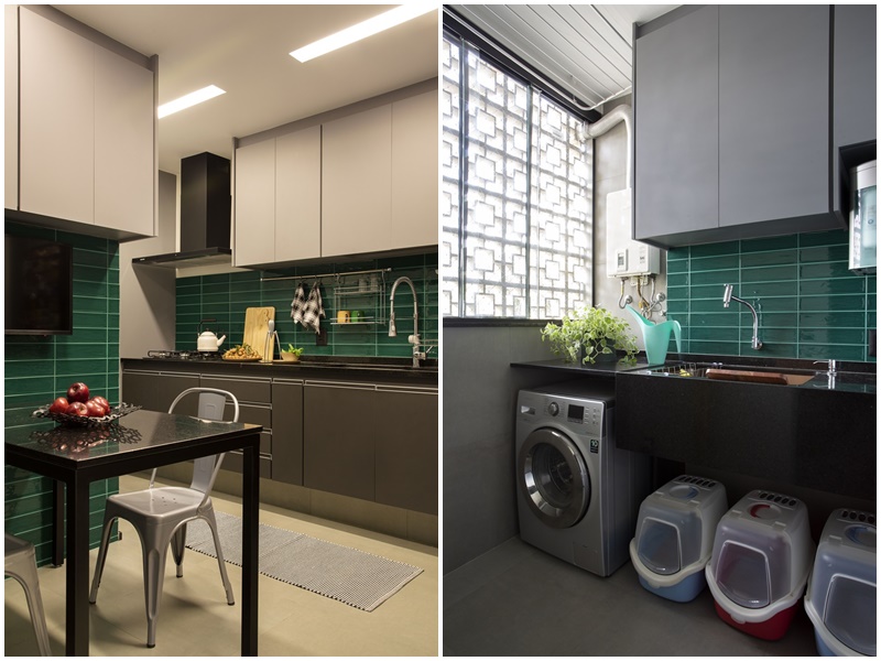 . A área de serviço, que ganhou uma cuba-tanque e, embaixo dela, um generoso espaço para acomodar as caixas de areia dos gatos.