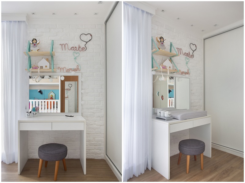 · Curiosidade sobre o projeto: No quarto havia uma mesa que foi adaptada para ser usada como trocador. Assim, após a fase das fraldas, o casal poderá reverter a mesinha para sua função original.