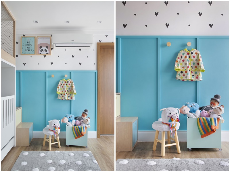 A partir daí, a dupla Livia e Rômulo lançou mão de cores vibrantes e divertidas, incluindo as paredes, que ganharam molduras pintadas de azul (com efeito de painel-boiserie), deixando uma faixa superior branca para receber adesivos românticos de corações e bolinhas. “O quartinho explora o lúdico e o décor remete ao moderno, com referências clássicas e românticas. Buscamos transmitir alegria, suavidade, acolhimento e sensação de bem estar”, resume a designer de interiores Livia Amendola.