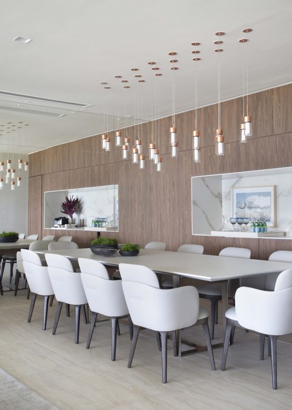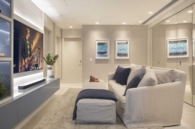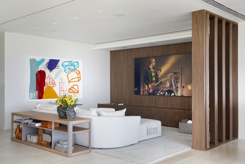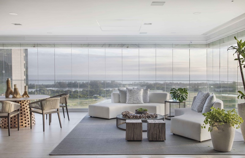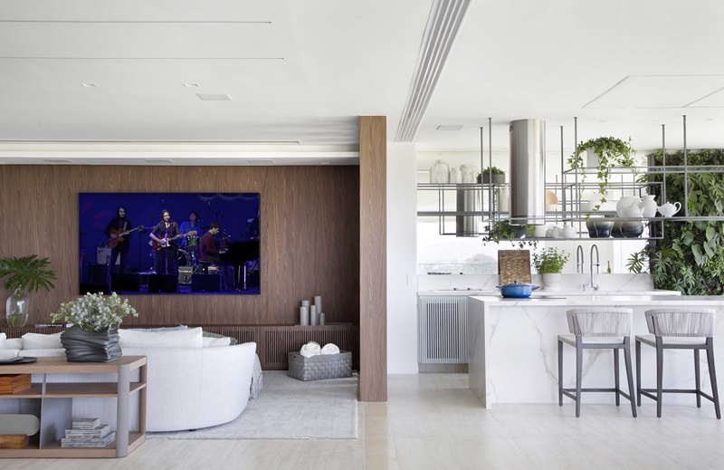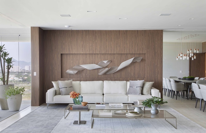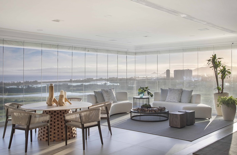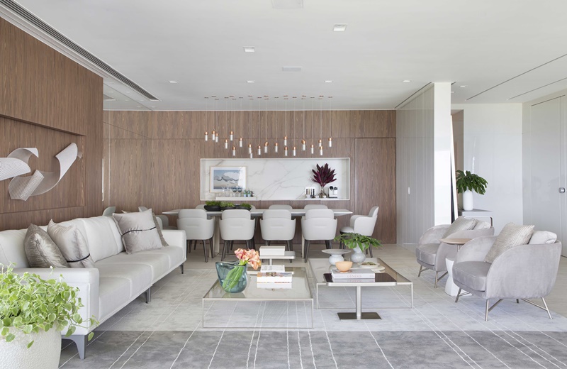Com vista panorâmica para o campo de golfe olímpico, com a praia da Barra da Tijuca ao fundo, a sala de estar e jantar ganhou ainda mais amplitude integrada à varanda, onde fica a cozinha de apoio. A paleta de cores é neutra, destacando as texturas dos revestimentos e mobiliário. Os painéis de parede em madeira escura aquecem a área da sala, conferindo sofisticação. Já a varanda gourmet ganhou uma decoração mais despojada, com móveis mais leves e armário aéreo em serralheria.