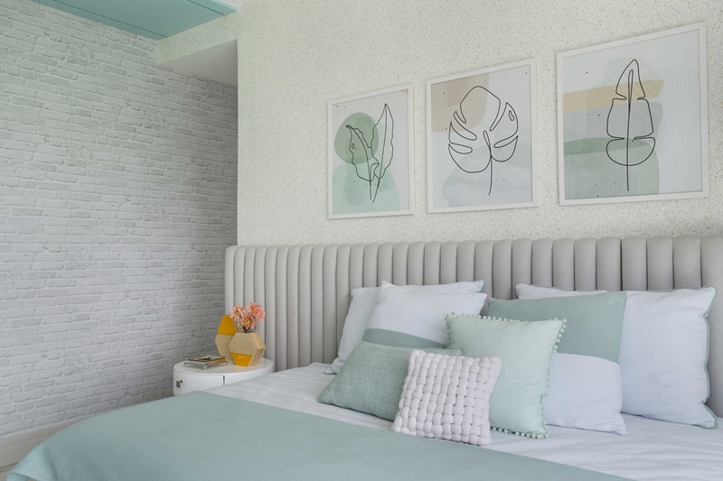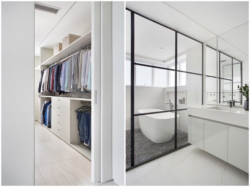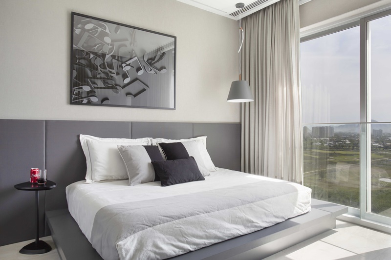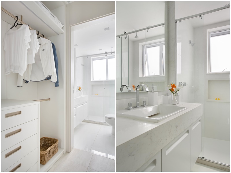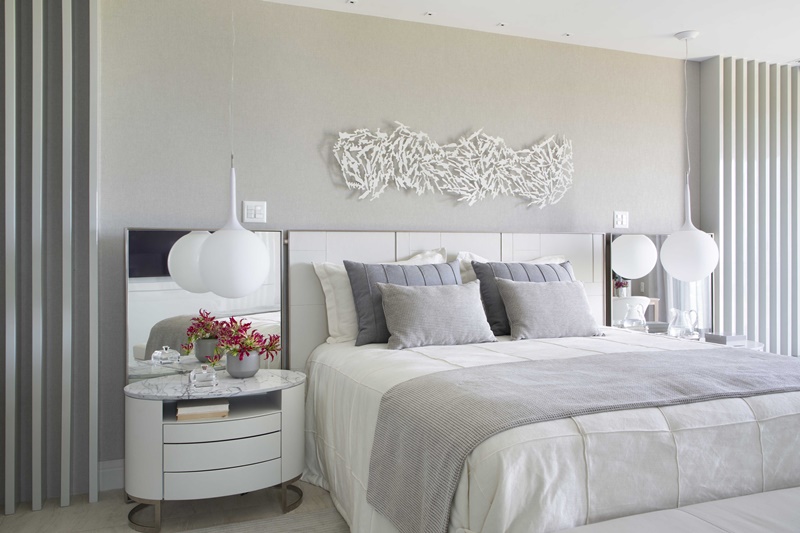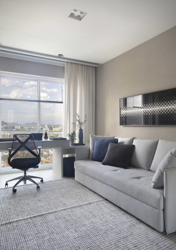 Em relação aos quartos, cada um exibe um estilo próprio. Na suíte principal, foi adotada uma paleta neutra, de brancos e acinzentados. A cabeceira retangular da cama, com espelhos nas laterais, contrasta com as luminárias e as mesas de apoio arredondadas. Já o banheiro da suíte ganhou uma moderna divisória com esquadrias pretas, separando a área molhada, onde foi instalado um piso de seixos na cor preta e uma banheira de imersão. O quarto de hóspedes, por sua vez, exibe uma paleta mais escura, em tons de cinza, preto e branco. Com cama tipo tatame e área de trabalho, o cômodo tem uma proposta mais funcional, sendo usado pela mãe, quando resolve dormir por lá, quanto por eventuais visitas.