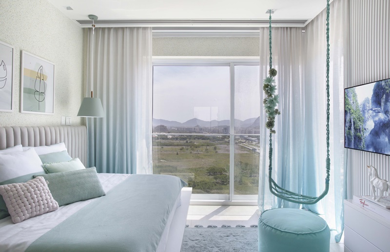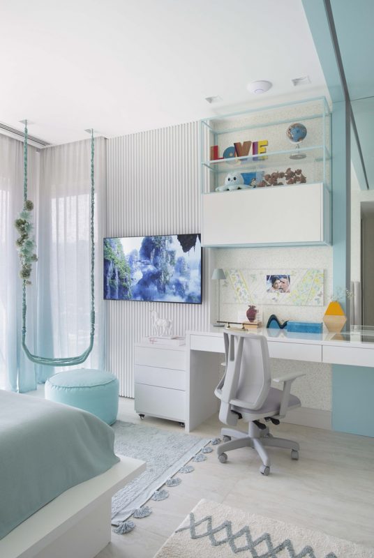 Para elaborar a suíte da filha, a arquiteta levou em consideração a uma série de requisitos da menina, que pediu por um quarto “instagramável” em tons de azul – “entre os vários desejos apontados por ela, que foram todos atendidos, adotamos cortina tie-dye, balanço de fixar no teto, closet, penteadeira, uma cama maior (tamanho viúva), tipo tatame, e um espelho grande para dançar e gravar vídeos para o Tik Tok”, lista a profissional.