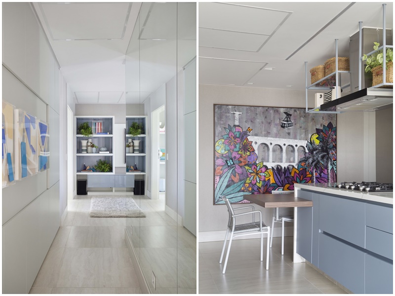 Ainda na sala, o cômodo passou por uma das principais alterações na planta durante a obra: a arquiteta quebrou uma parede, que separava a sala de jantar do corredor da área íntima, substituindo-a por uma marcenaria com dupla função: armários usados como rouparia no lado do corredor e um grande nicho que serve como aparador no lado voltado para o jantar. Outra alteração importante é a integração da sala íntima com a cozinha. “Como a sala íntima com TV é o ponto central do apartamento, um dos pedidos do cliente foi integrar este espaço com a ampla cozinha. Neste caso, a parede foi substituída por portas espelhadas piso-teto, tipo camarão, que podem ser totalmente recolhidas, dependendo da ocasião”, explica Cristina.