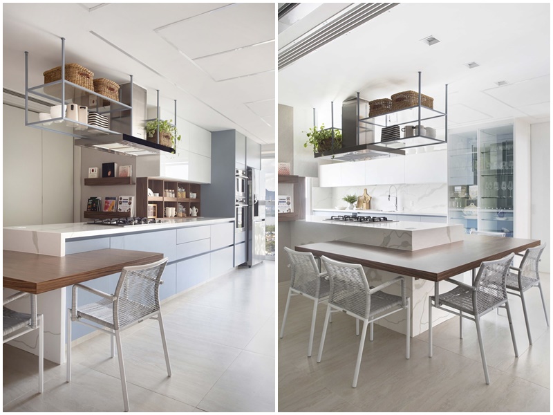 A cozinha principal é um dos pontos altos do imóvel. Iluminada, leve e prática, com medidas generosas, a cozinha ganhou as frentes dos armários na cor azul e bancadas revestidas em mármore. O espaço tem uma função agregadora: além de abrir para a sala íntima, a mesa em U, ao redor da bancada, reúne a família no preparo das refeições.